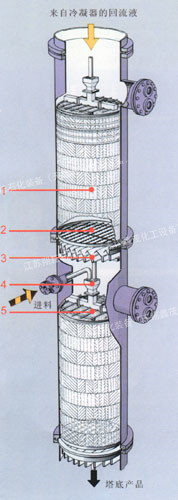 1、規(guī)整填料 2、支撐柵板 3、液體收集器 4、降液管 5、管式液體分布器 此結構適合于直徑小于800mm的填料塔。 |